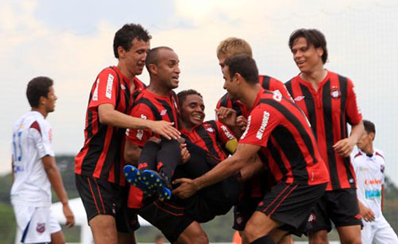 | Jogadores do Atlético-PR festejam um dos gols da goleada sobre o Toledo |